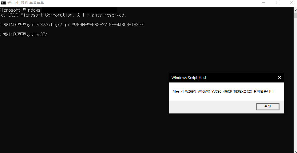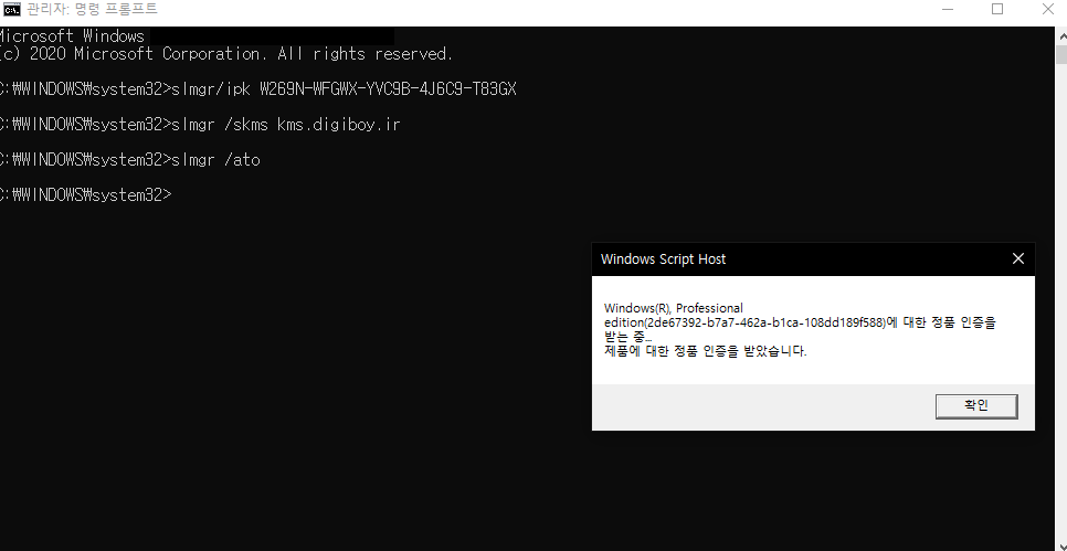 마지막 세 번째로 slmgr /ato 작성하시고 엔터를 누르면 ‘제품에 대한 정품 인증을 받았습니다.’ 라는 문구가 뜨며