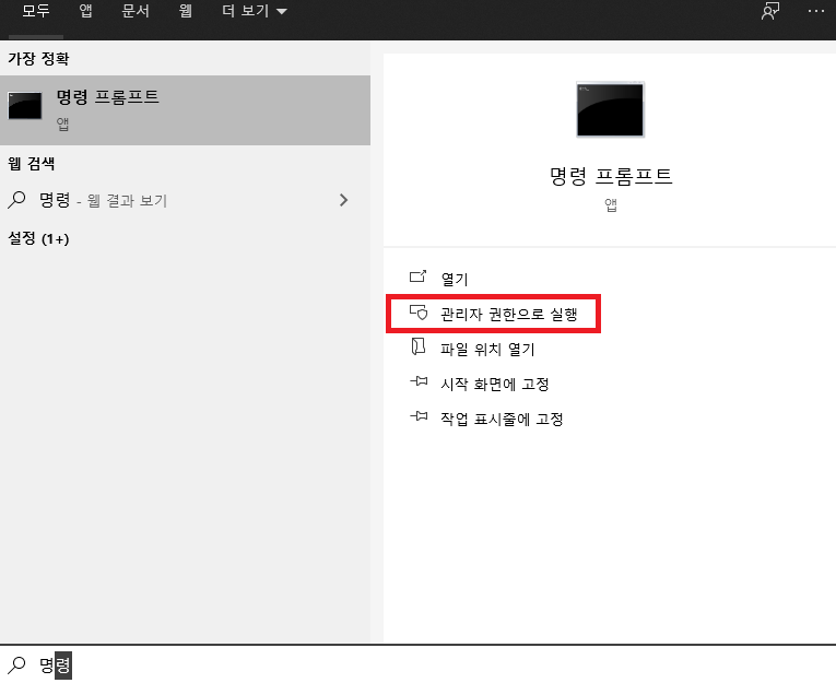 저는 키보드에 있는 시작 버튼을 누른 후 ‘명령’이라고 치니까 바로 명령 프롬프트 창이 뜹니다.